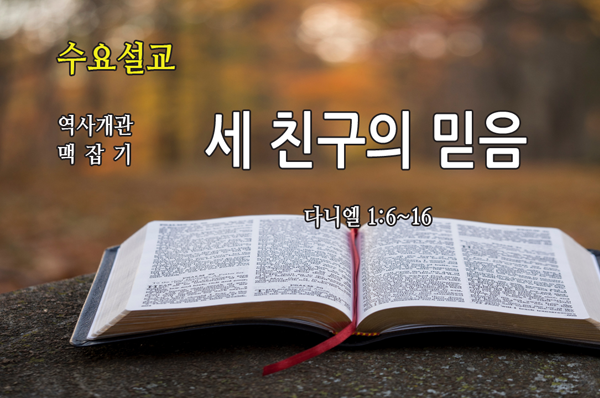말씀 : 다니엘 1장 6-16절 6. 그들 가운데는 유다 자손 곧다니엘과하나냐와미사엘과아사랴가 있었더니 7. 환관장이 그들의 …