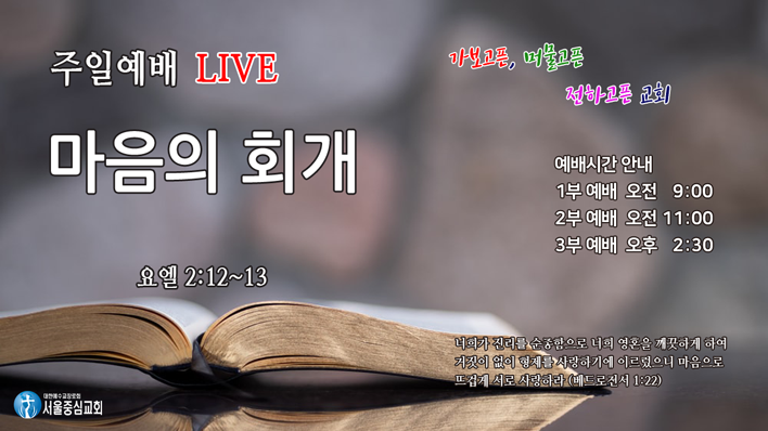 말씀 : 요엘 2장 12절-13절 12. 여호와의 말씀에 너희는 이제라도 금식하고 울며 애통하고 마음을 다하여 내게로 돌아오라 하셨나니 13. 너희는 옷을 찢지 말고 마음을 찢고 너희 하나님 여호와께로 돌아올지어다 그는 은혜로우시며 자비로우시며 노하기를 더디하시며 인애가 크시사 뜻을 돌이켜 재앙을 내리지 아니하시나니 인쇄 주소
