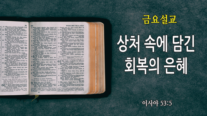 Loading the player... 말씀 : 이사야 53장 5절 5. 그가 찔림은 우리의 허물 때문이요 그가 상함은 우리의 죄악 때문이라 그가 징계를 받으므로 우리는 평화를 누리고 그가 채찍에 맞으므로 우리는 나음을 받았도다 인쇄 주소