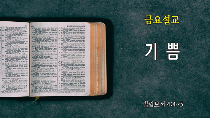 Loading the player... 말씀 : 빌립보서 4장 4-5절 4. 주 안에서 항상 기뻐하라 내가 다시 말하노니 기뻐하라 5. 너희 관용을 모든 사람에게 알게 하라 주께서 가까우시니라 인쇄 주소